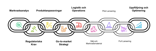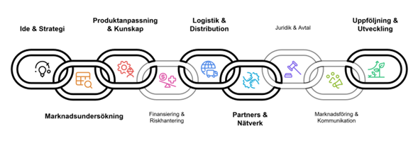 Exportresan handlar om att på ett strukturerat och professionellt sätt förbereda företaget för att ta steget utanför hemmamarknaden. Det innebär att analysera potentialen, förstå regelverk och krav, säkerställa produktens eller tjänstens anpassning för att maximera avkastning.